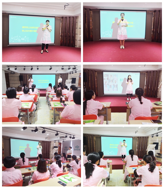 校长致辞后,教学团队上台进行了自我介绍。月嫂讲师李能、催乳师讲师徐玲、产后康复讲师汪慧都是从事临床医学出身,有着丰富的理论和实际经验,她们轮流为学员们介绍了课程相关内容并提出学习建议,希望学员们能够不忘初心、脚踏实地的学习,同时也送上了自己的祝福。