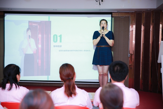 校长苏琼首先为大家介绍了金职伟业的组织架构,并表示金职伟业拥有专业的教学体系、优美的环境,确保学员们在学校能够专心学习,在工作中能够灵活运用所学知识,最后她表示金职伟业所有师资会倾囊相授,希望学员们好好学习,天天向上。
