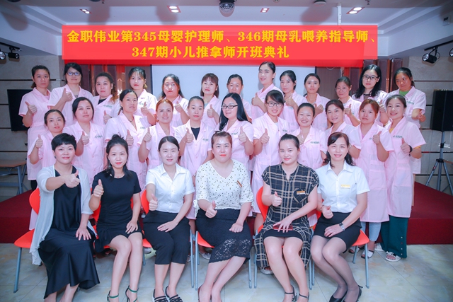 9月8日,长沙市金职伟业职业培训学校345期月嫂班、346期催乳师班、347期小儿推拿班三个班一起举行开班典礼。来自湖北、江西、贵州、湖南等全国各省市的学员齐聚长沙,为学习专业的母婴服务技能而努力。