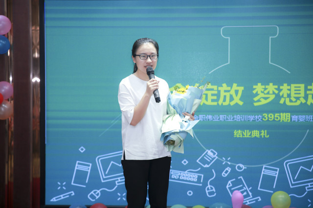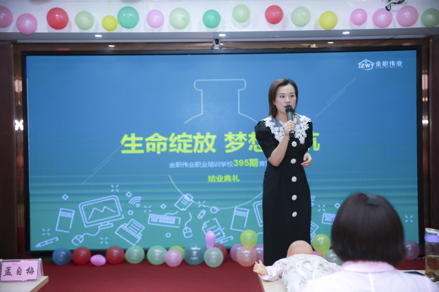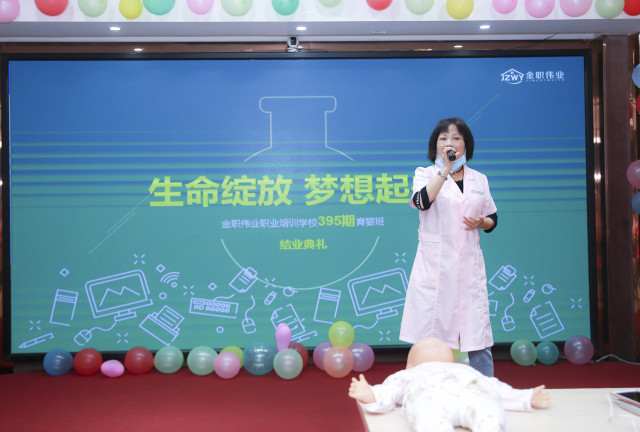 此次结业典礼由金职伟业教务班主任闫文杰老师主持,金职伟业大市场总监周娟、培训学校校长杨珺安、母婴护理资深讲师徐玲、教务班主任黄静、刘青青等出席并发言。