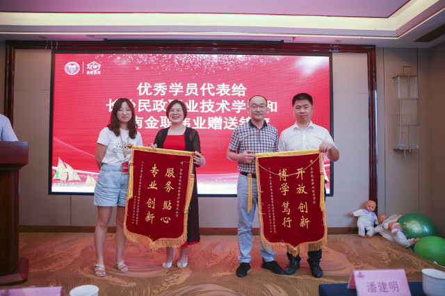 最后,优秀学员代表为长沙民政职业技术学院及金职伟业集团送上锦旗,以表深厚谢意及崇高敬意。