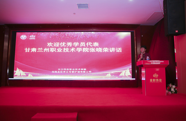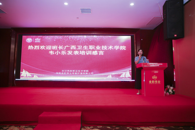 优秀学员代表甘肃兰州职业技术学院张晓荣老师发表感言。她首先代表全体学员感谢金职伟业集团所有领导、老师、工作人员的辛勤付出,并高度赞扬了理论与实践操作并举的培训方式及学前与医学跨界的合作模式。