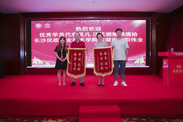 沧县职业技术教育中心老师吴凡、西藏昌都市职业技术学校老师汪屹,作为学员代表向长沙民政职业技术学院和金职伟业集团赠送锦旗。