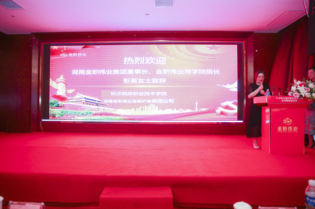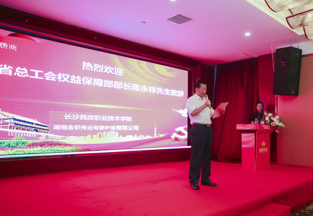 出席本次会议的领导有:湖南省总工会权益保障部部长陈永祥,长沙民政职业技术学院副校长唐晓宝、继续教育学院院长徐怀,湖南省家政服务行业协会秘书长杨飞,湖南金职伟业集团董事长、金职伟业商学院院长、卓越创业导师彭英,湖南省劳动和社会保障厅民办职业培训机构督导评估专家敬晓青,湖南金职伟业母婴护理有限公司事业发展部陈慧卿等出席并致辞。