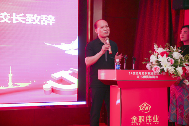 典礼伊始,湖南省总工会权益保障部部长陈永祥发表致辞。他首先详细介绍了“1+X”证书中“1”与“x”的具体含义,他在讲话中提到,“相信在金职伟业细心周到的组织安排和前来授课的行业名师耐心指点下,今天的开班典礼,只是金职伟业引领全国幼儿照护领域职业技能发展所迈的第一步征程,在彭英董事长和潘建明总裁的带领下,金职伟业势必会迅速崛起,发展成为一个朝气蓬勃且充满创造力的现代化教育综合体。”