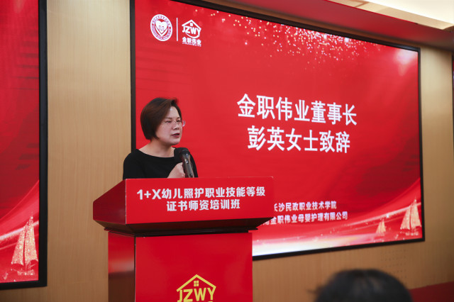 最后,湖南金职伟业集团董事长彭英发表讲话,她从三个方面进行了分享,其一,金职伟业将继续发挥好行业龙头企业的示范引领作用,带动更多托育、儿童保健、学前等领域企业规范发展、规模发展、质量发展;其二,金职伟业将不遗余力推动“1+X幼儿照护”等级证书制度落地,为获得X证书的学生搭建更多更广的就业创业平台;其三,她也号召有条件有需求的企业多拿出一些资源对学生群体加强就业、创业扶持,帮助他们更好地发展。