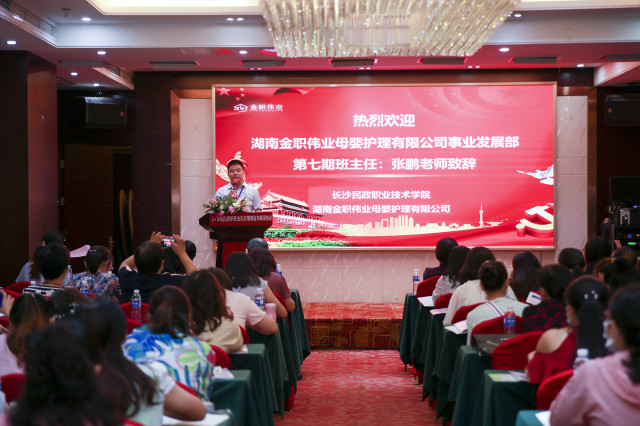 此次开班典礼由湖南省育婴师协会会长、湖南金职伟业现代家庭产业发展有限公司总裁潘建明主持,长沙民政职业技术学院继续教育学院院长徐怀,湖南金职伟业集团董事长、金职伟业商学院院长、卓越创业导师彭英,湖南省劳动和社会保障厅民办职业培训机构督导评估专家敬晓青,湖南金职伟业母婴护理有限公司创新创业导师兼第七期班主任张鹏等出席并致辞。