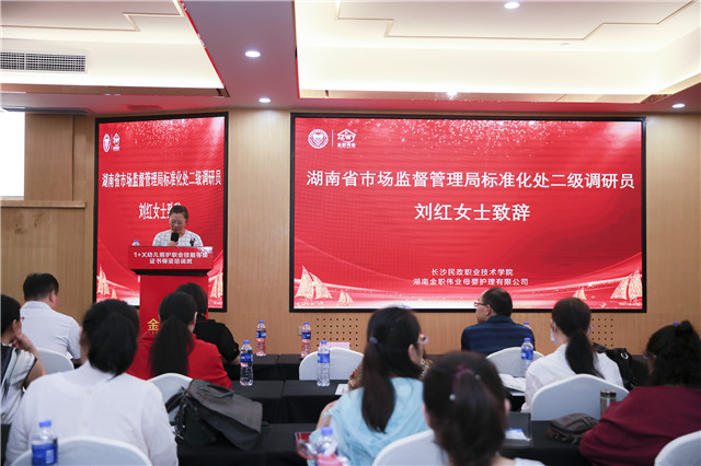 湖南省巿场监督管理局标准化处二级调研员刘红首先进行致辞。她在讲话中提到,“国家启动1+x证书试点工作,主要目的就是进一步发挥好学历证书作用,夯实学生可持续发展基础,同时通过院校内实施的职业技能等级证书培训提升职业活动和个人职业发展所需的综合人力。”