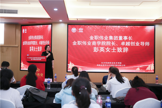 最后,湖南金职伟业现代家庭产业发展有限公司董事长彭英发表讲话。她从三个方面进行了分享,其一,金职伟业将继续发挥好行业龙头企业的示范引领作用,带动更多托育、儿童保健、学前等领域企业规范发展、规模发展、质量发展;其二,金职伟业将不遗余力推动“1+X幼儿照护”等级证书制度落地,为获得X证书的学生搭建更多更广的就业创业平台;其三,她也号召有条件有需求的企业多拿出一些资源对学生群体加强就业、创业扶持,帮助他们更好地发展。