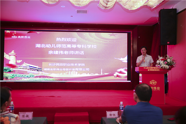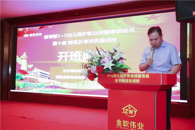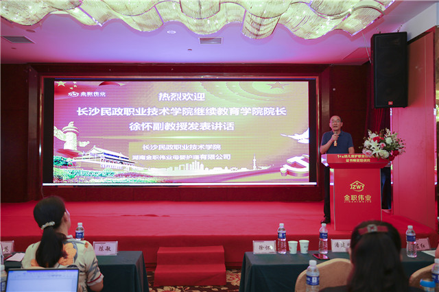长沙民政职业技术学院继续教育学院院长徐怀副教授发表讲话。他在讲话中提到“金职伟业作为1+x幼儿照护职业技能等级证书的评价组织机构,通过调动幼儿照护领域内骨干企业资源和院校资源,联合研制‘幼儿照护’职业技能等级标准,促进幼儿照护领域相关理论和技能加快形成,为推动健全完善1+x幼儿照护行业服务标准规范提供了工作准备。”