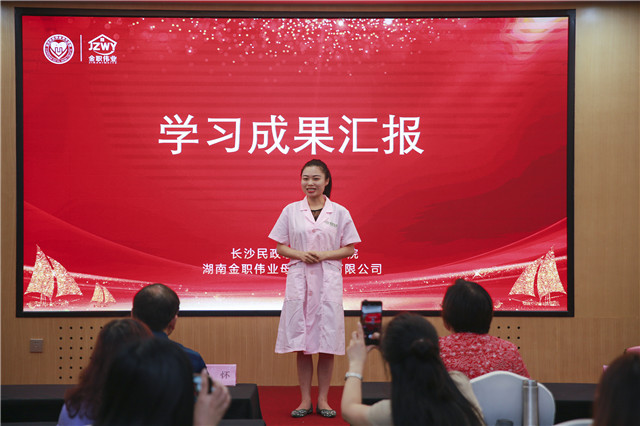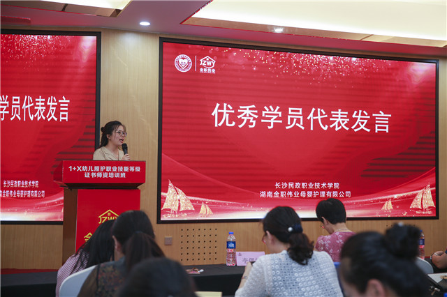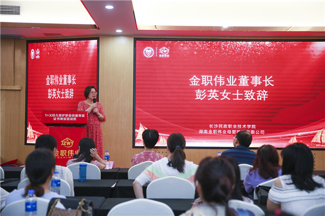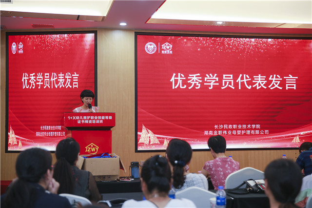 金职伟业集团董事长彭英女士发表结业致辞。她首先感谢教育部的大好政策,让金职伟业能够入围第三批1+X职业教育培训评价组织,同时对于各位专家教授从全国各地奔赴长沙参与此次培训表示感谢。“在今后,金职伟业将借助1+x平台、利用这个绝佳契机,不留余力地完善、创新幼儿照护领域的标准、课程、服务、教材体系,并积极落地‘1+x’幼儿照护课程实训基地的建设。”最后,她呼吁各位专家、老师在回校之后积极推动幼儿照护事业的实施落地。
