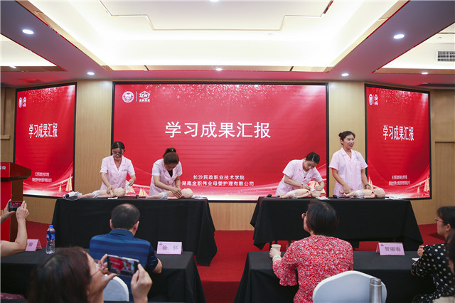 长沙民政职业技术学院继续教育学院院长徐怀,湖南金职伟业集团董事长、金职伟业商学院院长、卓越创业导师彭英,湖南省劳动和社会保障厅民办职业培训机构督导评估专家敬晓青,湖南金职伟业母婴护理有限公司幼儿照护技术负责人李偲婧等出席结业典礼。本次结业典礼由重庆朗萌巴蜀教育集团钟亚玲园长主持。