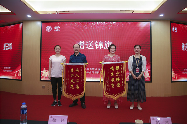 辽阳职业技术学院李莹老师、贵州省遵义市职业技术学校刘念老师作为学员代表向长沙民政职业技术学院和金职伟业集团赠送锦旗。
