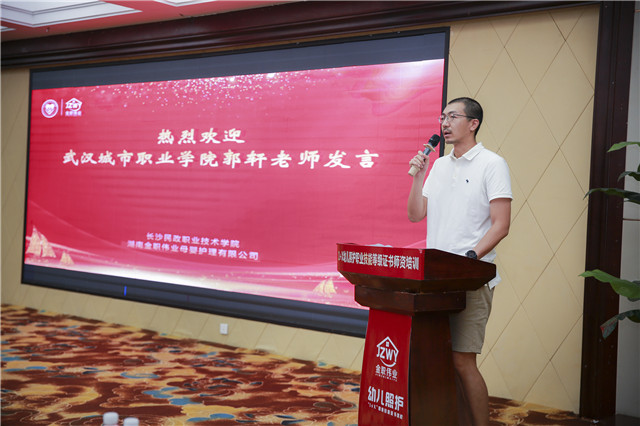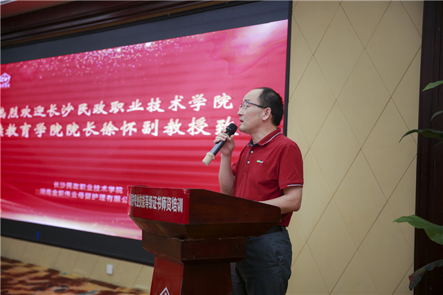 典礼伊始,长沙民政职业技术学院继续教育学院院长徐怀发表讲话。他呼吁金职伟业与长沙民政职业技术学院在今后继续深入合作,广泛开展此类师资培训,充分营造严谨好师、进取创新的幼儿照护领域学科发展精神。