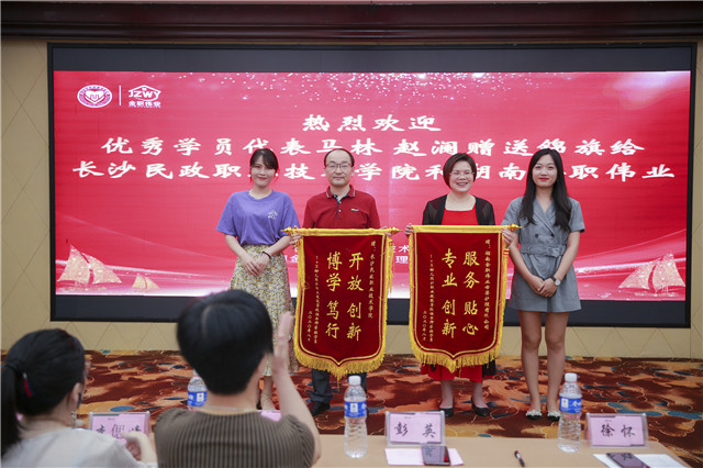 随后,本期优秀学员代表为长沙民政职业技术学院及湖南金职伟业集团赠予锦旗。
