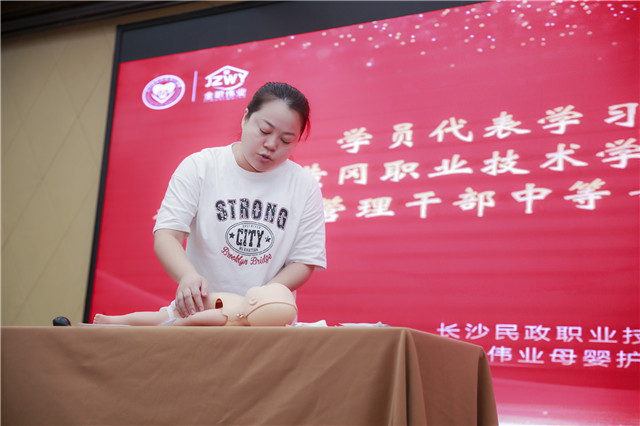 结业典礼上,黄冈职业技术学院王伟老师、贺州市经济管理干部中等专业学校黄碧灵老师、阿米婴童学苑郭涵老师,作为学员代表进行实操及考评演示,她们动作标准、话术专业,展现出1+x幼儿照护职业技能等级证书考评员的无限风采。