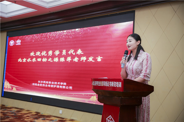 北京水米田幼之源陈萍老师作为优秀学员代表进行讲话。她首先强调当下不负,未来不惧。