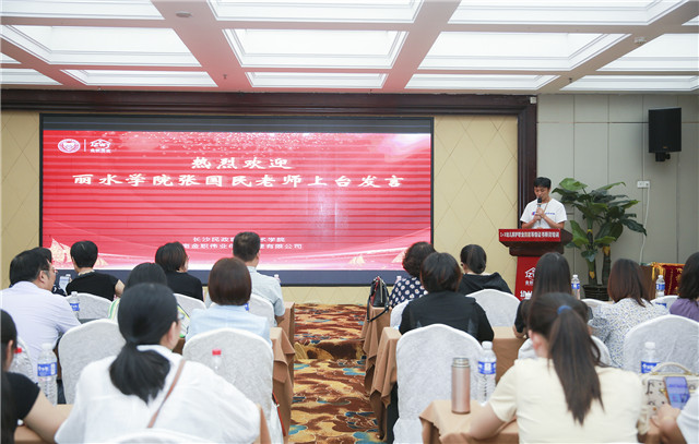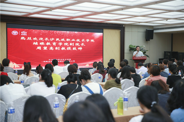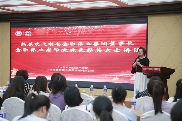 金职伟业集团董事长彭英发表致辞,她首先感恩长沙民政职业技术学院对公司的大力支持,也感谢老师们千里迢迢来此参加培训,同时也希望各位老师在回校之后能积极推动幼儿照护事业的实施和落地。