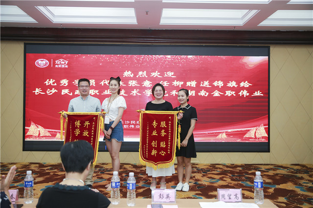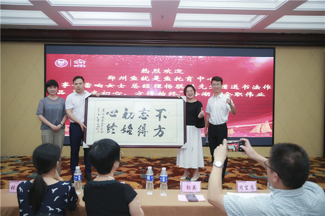 随后,本期优秀学员代表为长沙民政职业技术学院及湖南金职伟业集团赠予锦旗。河南郑州鱼就是鱼托育为湖南金职伟业集团赠予书法牌匾“不忘初心,方得始终”。