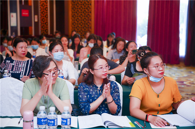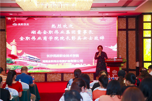 湖南金职伟业现代家庭产业发展有限公司董事长彭英发表致辞。她首先对与会老师以及远在新疆参与线上培训的老师表示热烈欢迎,并分享了以下三点内容:其一,党的好政策,金职人在路上。在国家教育、人才、产业政策的大力支持下,金职伟业迎来了发展的春天,希望今后能够与各位携手,实现学生好学、老师好教、企业好用的伟大目标。其二,充分发挥幼儿照护等级证书对学校、教师、学生的作用,实现国家职业教育的改革与创新。其三,金职伟业将继续发挥好行业龙头企业的示范引领作用,带动更多托育、儿童保健、学前等领域企业规范发展、规模发展、质量发展。