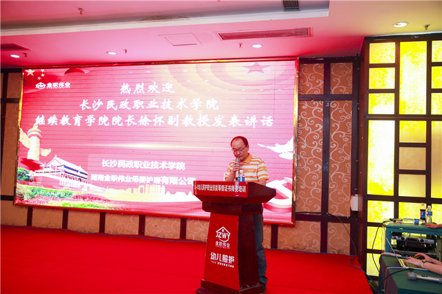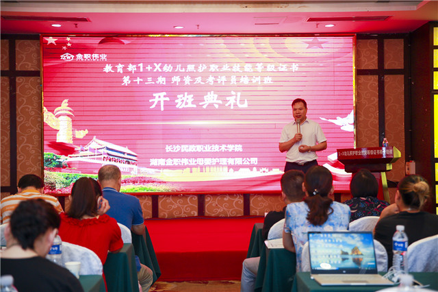 典礼伊始,长沙民政职业技术学院继续教育学院院长徐怀副教授率先发表致辞。他表示,金职伟业作为1+X幼儿照护职业技能等级证书的评价组织机构,通过调动幼儿照护领域内骨干企业资源和院校资源,联合研制“幼儿照护”职业技能等级标准,促进幼儿照护领域相关理论和技能加快形成,为推动健全完善幼儿照护行业服务标准规范提供了工作准备,长沙民政职业技术学院将大力支持金职伟业培训工作。最后,他希望全体学员能够充分发扬“顽强拼搏、勇于进取”的奋进精神,优质高效地完成各项学习工作。