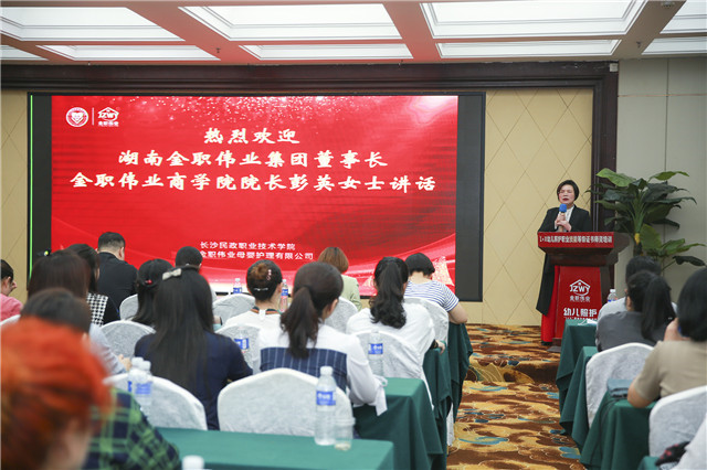 本次结业典礼,由渭南幼儿师范学校赵旭志老师主持。长沙民政职业技术学院继续教育学院院长徐怀、医学院老师贺丽春,湖南金职伟业集团董事长、金职伟业商学院院长、卓越创业导师彭英,湖南省育婴师协会会长、湖南金职伟业现代家庭产业发展有限公司总裁潘建明,湖南金职伟业母婴护理有限公司幼儿照护技术负责人李偲婧等出席。