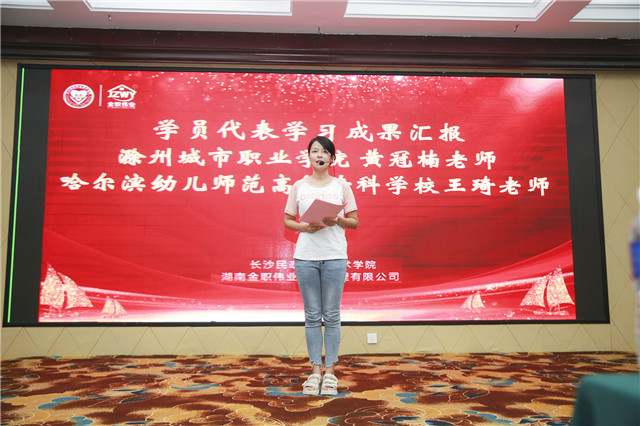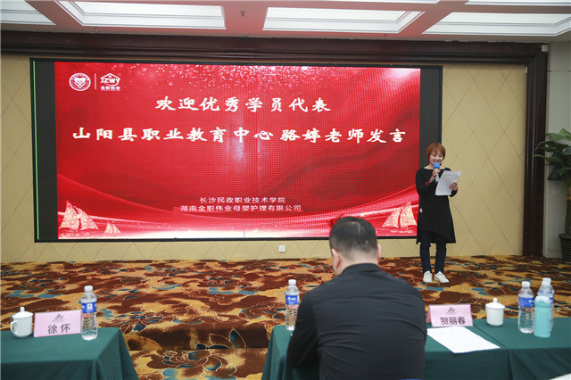 山阳县职业教育中心骆婷老师作为优秀学员代表进行讲话。她表示在这里体会到了彭英董事长及各位老师的魅力,感受到了名校的独特风采,也感受到了培训会务组的温暖情怀,更了解到国家对职业教育改革的政策。她希望能与在座的所有老师一起努力,为职业教育奉献自己全部的力量。