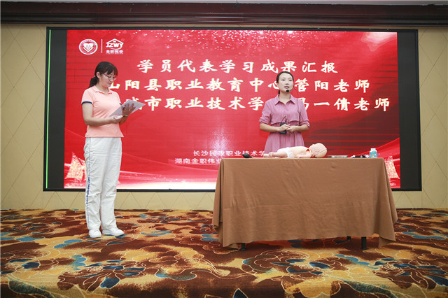结业典礼上,山阳县职业教育中心管阳老师、西宁城市职业技术学院马一倩老师、滁州城市职业学院黄冠楠老师、哈尔滨幼儿师范高等专科学校王琦老师,作为学员代表进行实操及考评演示,她们动作标准、话术专业,展现出1+x幼儿照护职业技能等级证书考评员的无限风采。