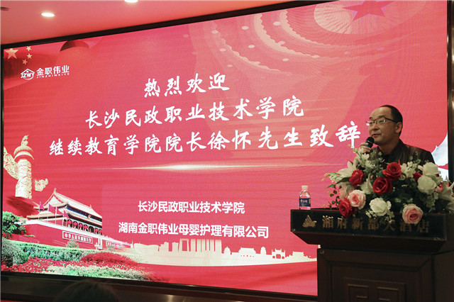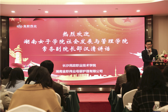 典礼由湖南省育婴师协会会长、湖南金职伟业现代家庭产业发展有限公司总裁潘建明主持,长沙民政职业技术学院继续教育学院院长徐怀,湖南女子学院社会发展与管理学院常务副院长、国际注册家政企业管理师、湖南省早期教育研究会常务理事、湖南省民政厅专家咨询委员会委员邵汉清,湖南金职伟业集团董事长、金职伟业商学院院长、卓越创业导师彭英,湖南省劳动和社会保障厅民办职业培训机构督导评估专家敬晓青等出席。