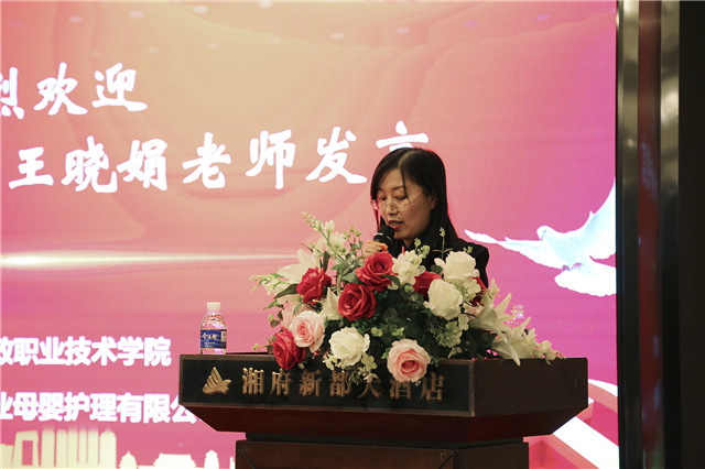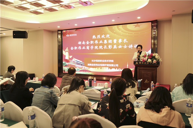 最后,湖南金职伟业集团董事长彭英进行总结讲话,她从三个方面进行了分享,其一,金职伟业将继续发挥好行业龙头企业的示范引领作用,带动更多托育、儿童保健、学前等领域企业规范发展、规模发展、质量发展;其二,金职伟业将不遗余力推动“1+X幼儿照护”等级证书制度落地,为获得X证书的学生搭建更多更广的就业创业平台;其三,她也号召有条件有需求的企业多拿出一些资源对学生群体加强就业、创业扶持,帮助他们更好地发展。