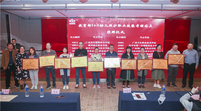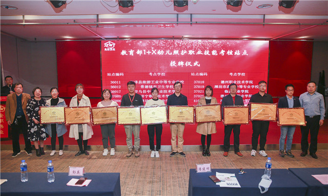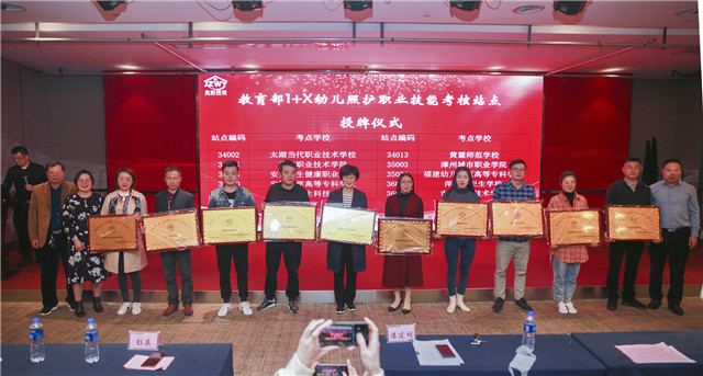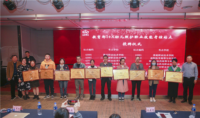 随后,迎来了最激动人心的时刻—授牌仪式。湖南金职伟业集团为来自全国各地的90余所职业院校、应用型本科高校颁发“教育部第三批幼儿照护1+x证书试点考核站点”牌匾。这标志着幼儿照护职业技能等级证书的影响力将不断被扩大,在今后,金职伟业也将携手各大院校不断提升幼儿照护领域专业人才的培养质量,为社会源源不断地输送高素质的技能型人才。