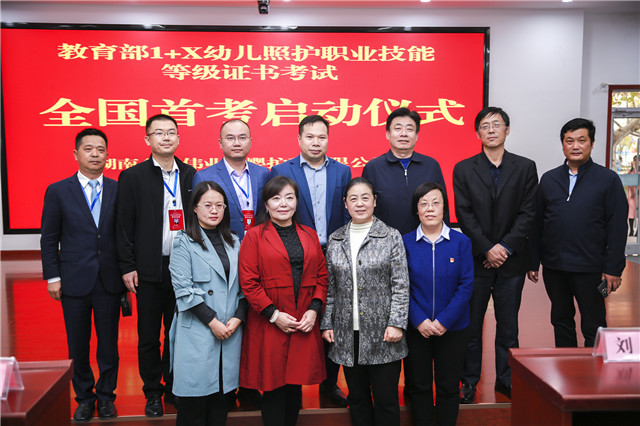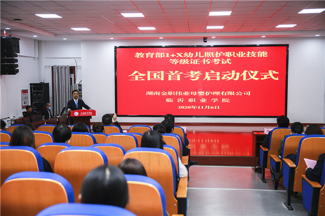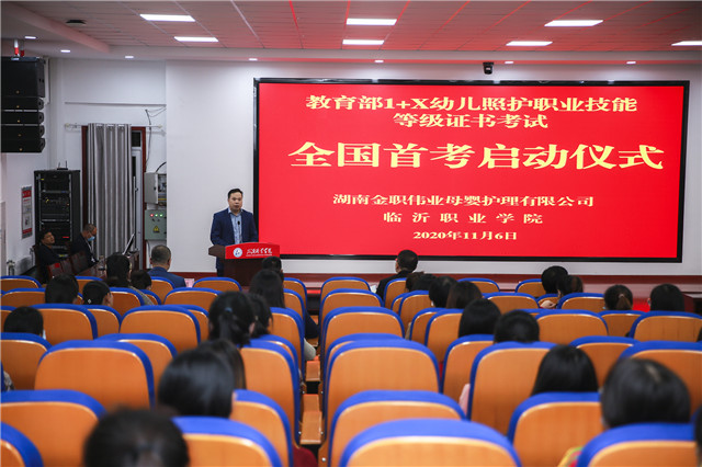 11月6日下午,教育部第三批1+X幼儿照护职业技能等级证书考试全国首考仪式在山东临沂职业学院美术馆报告厅隆重举行。金职伟业集团总经理潘建明率队出席并讲话。