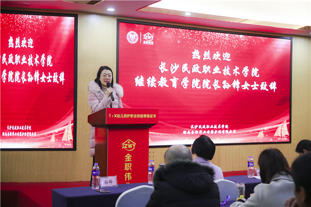 典礼伊始,长沙民政职业技术学院继续教育学院院长孙锋进行致辞。她希望在今后各位专家教授能与金职伟业及长沙民政职业技术学院保持密切联系,也希望大家能够不断推进幼儿照护证书的落地实施,并为这一共同目标努力奋斗。