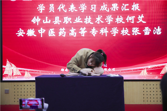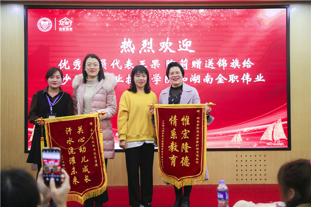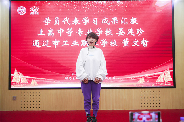 紧接着,本期优秀学员代表昆明卫生职业学院王果老师、钟山县职业技术学校陶莉老师为长沙民政职业技术学院及湖南金职伟业集团赠予锦旗。