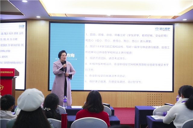 最后,金职伟业集团董事长彭英发表讲话,她就此次典礼分享以下三点:其一,感恩国家的好政策,搭建了幼儿照护事业的交流平台。其二,其二,金职伟业在今后会不留余力地继续创新幼儿照护领域的标准、课程、服务、教材体系;其三,期待各位专家、老师在回校之后能够积极推动幼儿照护事业的实施落地,培养出更多的优秀幼教人才。
