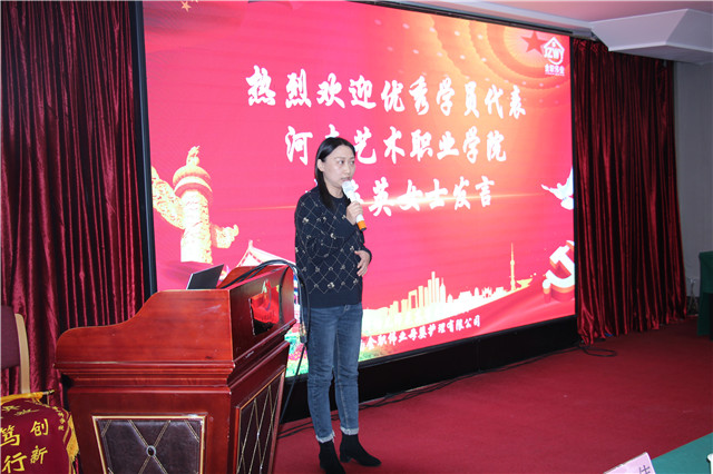 来自河南艺术职业学院的李海英老师作为优秀学员代表进行发言。她首先对湖南金职伟业集团提供的此次培训机会表示衷心地感谢,同时表示在培训期间,收获良多,对于1+X幼儿照护职业技能等级证书制度有了一个充分的了解,在回校之后,一定会做好相关考评工作。