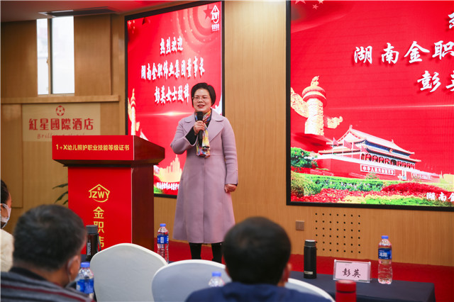 湖南金职伟业集团董事长彭英提到,在座各位老师现从事的考核评价工作,它不仅事关14万余名院校考生的切实利益,还关系到各个考核站和院校考核点的声誉,她表示,金职伟业将不遗余力继续推动“1+X幼儿照护”职业技能等级证书制度的落地,也将继续携手各大院校深耕托育托幼行业,致力于培养更多优秀的幼儿照护专业人才。