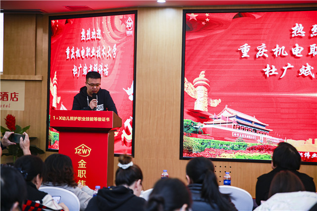 重庆机电职业技术大学健康与国际教育学院学前教育教研室主任杜广彬老师作为学员代表发表感言。他首先简单介绍了重庆机电职业技术大学的专业及师资实力,并对金职伟业提供此次督导员培训机会表示衷心地感谢。“在回校之后,我们会努力做好幼儿照护证书考试的督导员工作,遵守职业道德,严格按照督导要求执行。”