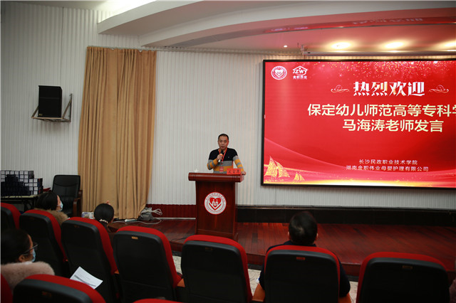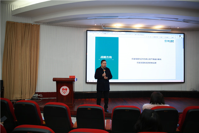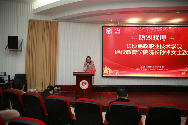 典礼伊始,长沙民政职业技术学院继续教育学院院长孙锋进行致辞。她希望在今后各位专家教授能与金职伟业及长沙民政职业技术学院保持密切联系,也希望大家能够不断推进幼儿照护证书的落地实施,并为这一共同目标努力奋斗。