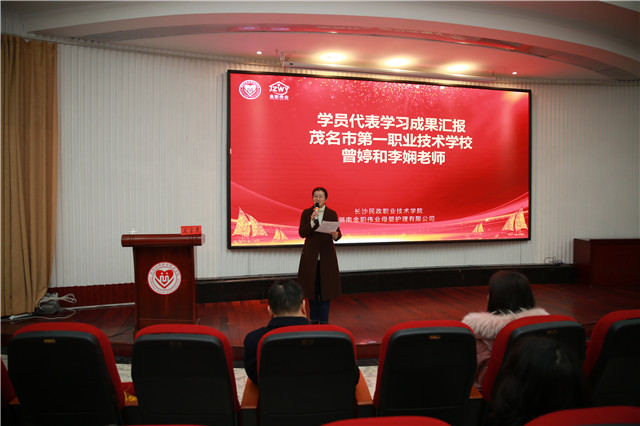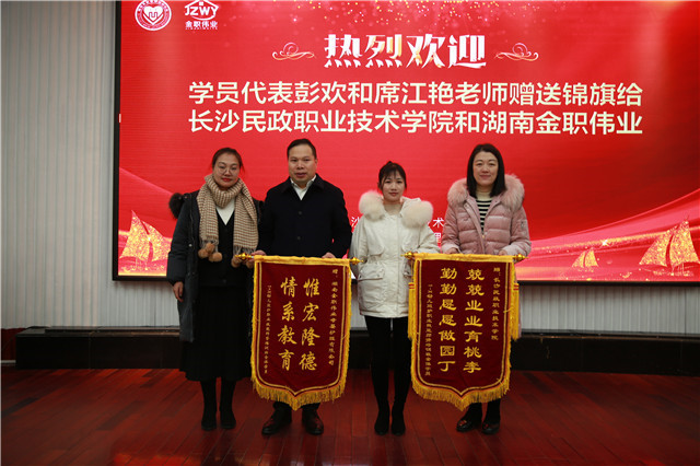 紧接着,本期优秀学员代表江西省通用技术工程学校彭欢老师、宣化科技职业学院席江艳老师为长沙民政职业技术学院及湖南金职伟业集团赠予锦旗。