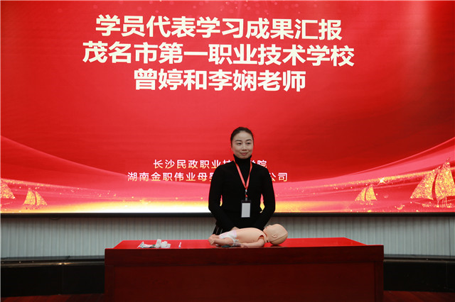 结业典礼上,优秀学员代表茂名市第一职业技术学校曾婷、李娴老师进行“心肺复苏技术”实操及考评演示。临洮县职业技术教育中心林怡老师、漳州卫生职业学院张志芳老师进行早教活动实操及考评演示。