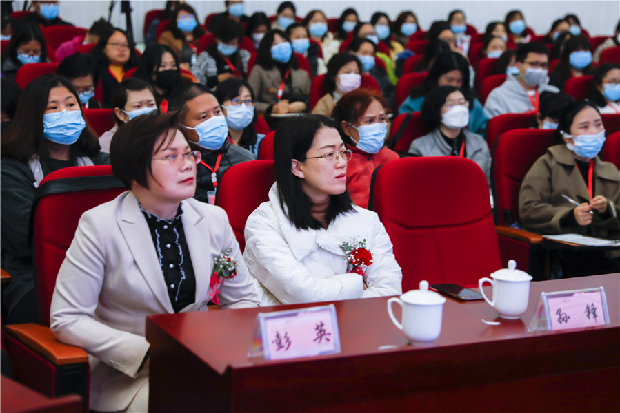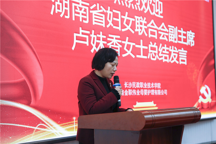 在颁奖仪式之后,湖南省妇女联合会副主席卢妹香做了重要讲话。她首先对金职伟业董事长彭英荣膺“全国巾帼建功标兵”表示热烈祝贺,并对于《国民经济和社会发展第十四个五年规划和2035年远景目标纲要》中涉及职业教育、产教融合、托育托幼、家政服务的相关内容进行解读。“就现今而言,我们对于产教融合的认识不应仅停留在某个政策或某项工程的层面,而要站在全局性的战略高度,深刻认识到产教融合是高等教育、职业教育面向未来变革的核心机制之一,充分意识到深化产教融合为职业院校和企业发展提供了重大的历史性机遇。”最后,她表示,相信在金职伟业细心周到的组织安排和前来授课的行业名师的耐心指点下,全体学员一定学有所成。“今天的开班典礼只是一个开始,期待未来的你们能够成为引领全国幼儿照护领域职业技能发展迈向新征程的功臣。”