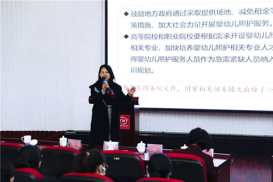 湖南中医药高等专科学校党委副书记、校长陈燕教授以“1+X幼儿照护人才培育新思路”为主题进行专家讲座,她从教育部1+X幼儿照护职业技能等级证书的政策背景、高级教材编纂介绍、应用展望三个方面进行延展,讲解全面细致,干货满满。