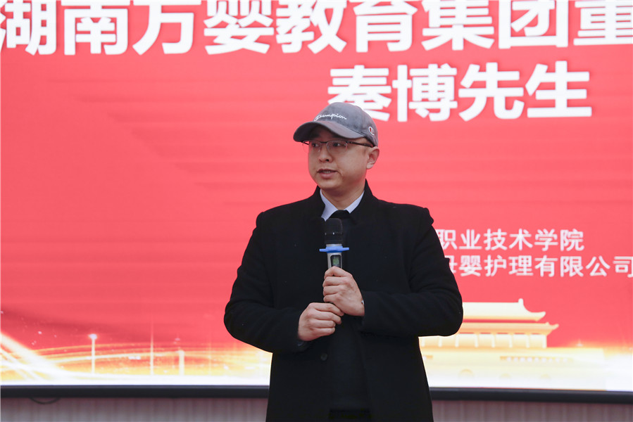 湖南万婴教育集团董事长助理秦博先生作为此次培训的学员代表上台发言。他首先从婴幼儿托育市场现状、托育行业人才需求等方面进行详细剖析,他表示现今正面临专业人员严重不足,培训系统性差,理论知识不充足、课程体系不健全等问题,因此拥有一支高素质的照护人才培养队伍非常迫切。最后,他代表全体学员进行表态,表示在培训期间一定会遵守培训规章制度,潜心学习,高质量地完成各项培训任务。