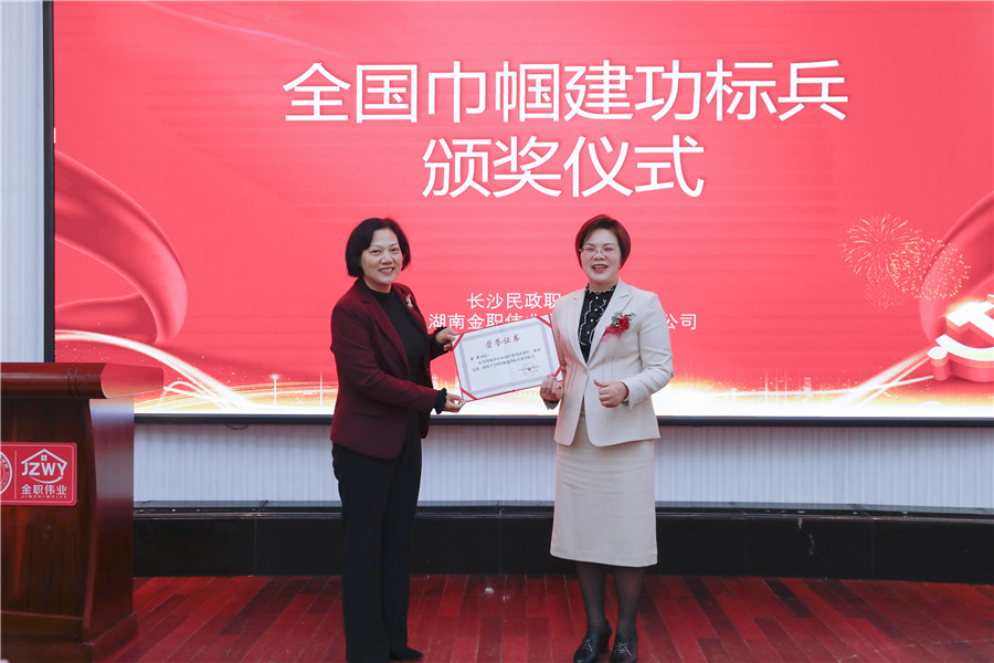 值得一提的是,在活动现场,湖南省妇女联合会副主席卢妹香代表湖南省妇女联合会为金职伟业董事长彭英颁发“全国巾帼建功标兵”证书。此前,在推选全国城乡妇女岗位建功先进个人(集体)活动上,金职伟业董事长彭英凭借为母婴、家政领域做出的突出贡献及通过技能助力精准扶贫的诸多事迹,荣膺“全国巾帼建功标兵”。
