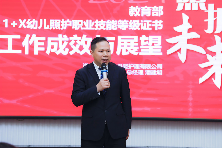 最后,湖南金职伟业集团总经理、湖南育婴师协会会长潘建明就教育部1+X幼儿照护职业技能等级证书2020年度工作成效及2021年度工作展望进行总结汇报。他在汇报中提到,“2020年,金职伟业共计开设教育部1+X幼儿照护职业技能等级证书各类培训30余期,共培训5,000余人次,完成近400家考评站点的遴选工作及35,000余学生的考评工作,平台线上培训逾100,000人”。潘建明表示,下一步,金职伟业将依托幼儿照护、产后恢复1+X证书评价平台,汇聚1000所试点学校、10000家校企合作企业、100家行业协会、1000000名学生进入金职母婴平台,每省遴选龙头企业成立社会培训基地、做好学生的考评服务和学生就业创业服务工作,打造考试、培训、就业、创业的广阔舞台。