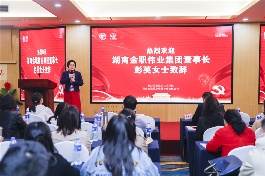 典礼伊始,湖南金职伟业集团董事长彭英发表致辞,首先她衷心感谢在座所有老师对金职伟业的支持和信任,随后,就本次培训她分享了以下三点内容:其一,国家高度重视职业教育的发展,并明确提出职业教育与普通教育处于同等地位,职业教育大有可为;其二,彭英对2020年金职伟业在幼儿照护工作上取得的一系列成果进行总结汇报,“金职伟业共开设1+X幼儿照护职业技能等级证书师资及考评员培训27期、考务技术员培训6期、督导员培训6期,共培训5000余人次”;其三,她希望每位老师能静心学习考务技术与督导的相关知识,严格考评,成为一名合格的幼儿照护考评员、督导员。