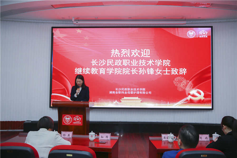 典礼伊始,长沙民政职业技术学院继续教育学院院长孙锋率先发表致辞。首先,她对本次1+X幼儿照护职业技能等级证书师资及考评员培训班的顺利召开表示祝贺,同时也对全体老师的到来表示热烈欢迎。孙峰提到,金职伟业作为一家有情怀、有大爱和有高度责任感的企业,自承担幼儿照护职业技能等级证书评价工作以来,充分调动幼儿照护领域内骨干企业资源和院校资源,联合研制《幼儿照护职业技能等级标准》,促进幼儿照护领域相关理论和技能加快形成,为推动健全完善幼儿照护行业服务标准规范做了充分准备。“今后,长沙民政职业技术学院将继续支持和配合金职伟业的培训工作,希望各位同仁能抓住此次培训机会,认真学习,创新幼儿照护人才培养模式。”