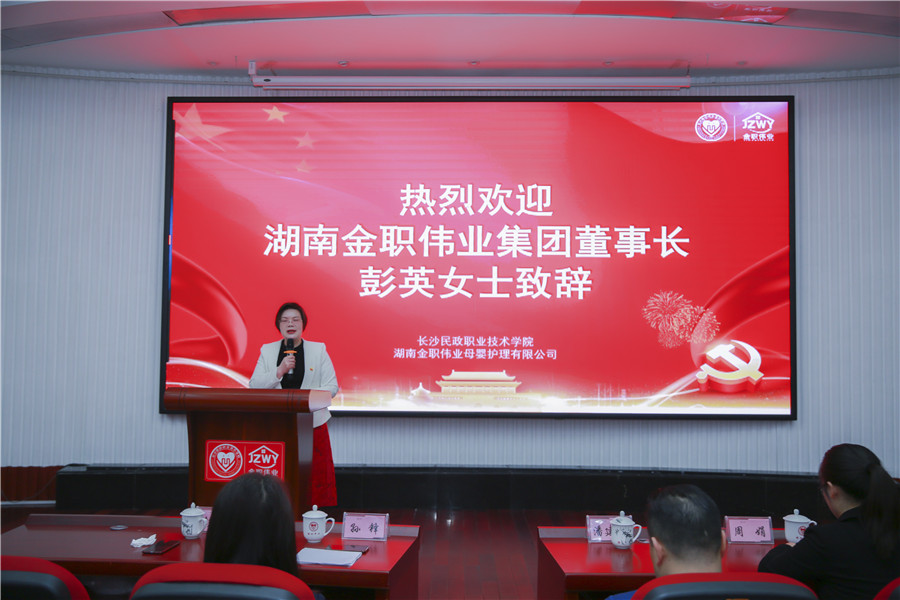 湖南金职伟业集团董事长彭英发表讲话,她提到金职伟业作为1+X第三批幼儿照护职业技能等级证书职业教育培训评价组织,将充分发挥幼儿照护职业技能等级证书对学校、教师、学生、企业的作用,实现国家职业教育的改革创新:对学校,国家重点支持“各地中、高职院校开展1+X证书制度试点,匹配相对应的资金补贴;对教师,将在座的每一位老师打造成为1+X幼儿照护双师资型老师,在回校后引领和推进幼儿照护证书实施、落地;对学生,提升就业能力,拓宽就业面;对企业,金职伟业作为湖南省第一批拟建设培育产教融合型企业,将积极引领、打造更多产教融合型企业。最后,彭英表示,2021年是十四五开局之年,我国将开启全面建设社会主义现代化国家新征程,金职伟业将以习近平新时代中国特色社会主义思想为指导,坚持为党育人,以突出成绩喜迎中国共产党建党100周年。