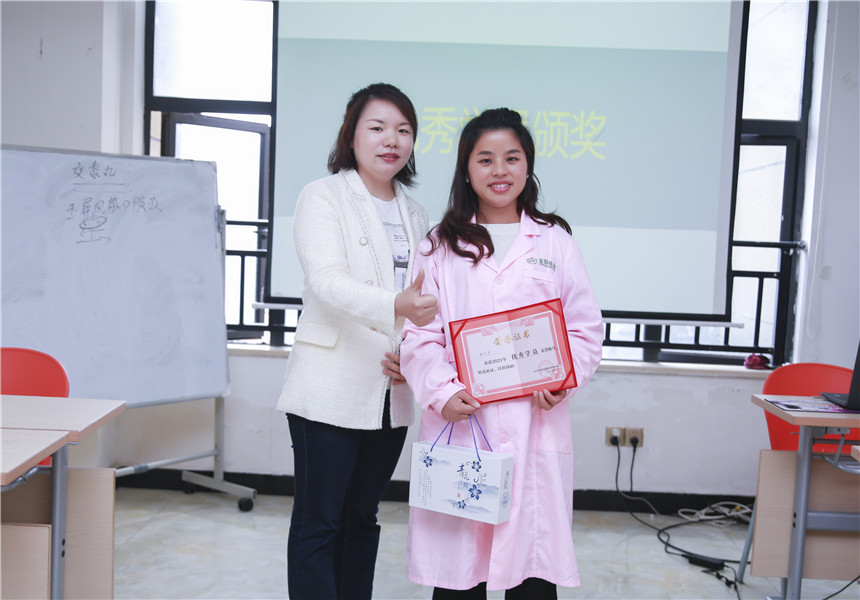 紧接着,资深小儿推拿讲师陈喜南为学员谢泳平颁发优秀学员证书。“非常荣幸能获得这个奖,12天的学习过得极为充实,在这里我学到了很多知识,很感谢金职伟业的老师,她们都很有耐心,有问必答,一点也不会觉得麻烦,也感谢所有学员姐妹,希望今后大家也能多联系,一起加油进步。”谢泳平分享道。
